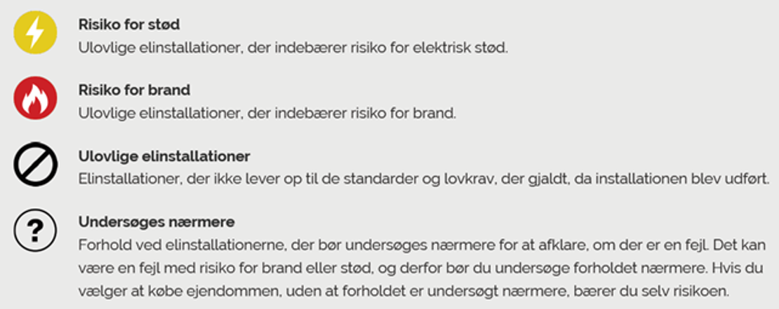 De fire symboler giver dig et hurtigt overblik over eventuelle fejl i en bolig. Alle fejl i el-installationer er ulovlige. Nogle fejl er udelukkende ulovlige, mens andre både er ulovlige og udgør risiko for brand eller stød.
